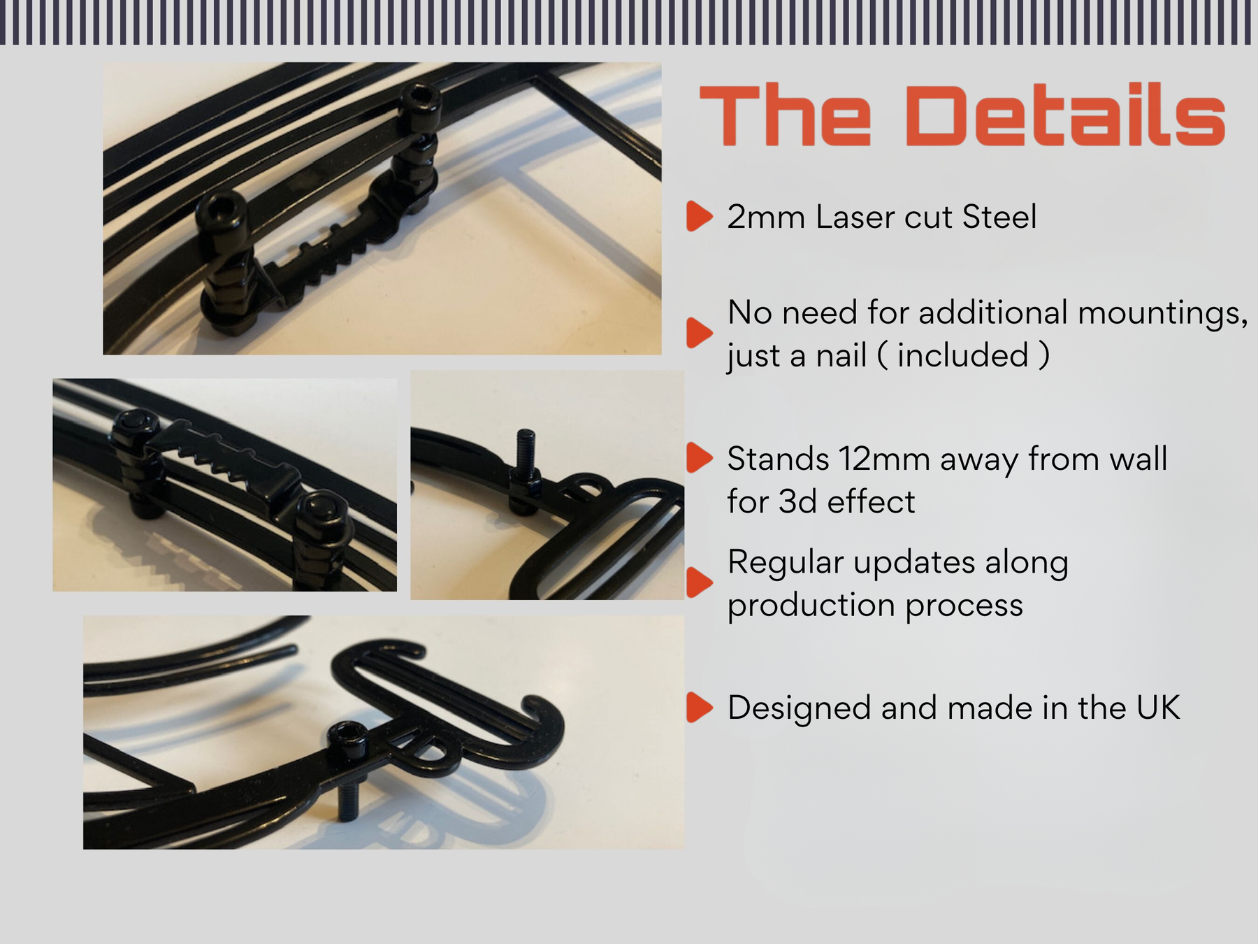 To give an exceptional finish, we laser cut our designs from 2mm steel, hand-polish them and powder-coat them in satin black. This will ensure superior quality and performance even if you want to mount your art piece outside.